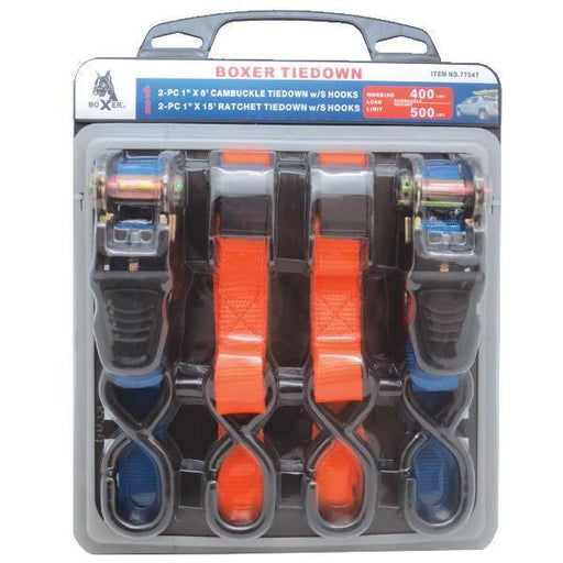 Boxer ToolsThis double value pack comes with two ratchet tie downs and two cam buckle tie downs. The ratchet tie downs comes with two rubber-handle ratchets, ...