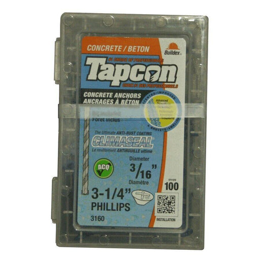 TapconTapcon Concrete Anchor with Bit, 3/16 in Dia, 3-1/4 in L, Head Type: Flat, Phillips, Climaseal
