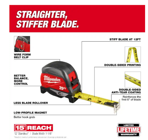 MILWAUKEE ELECTRIC TOOL CORPThe MILWAUKEE 25ft Magnetic Tape Measure delivers a Straighter, Stiffer Blade. The blade remains stiff at 12', resulting in less blade rollover an...