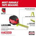 The MILWAUKEE® 8m/26ft STUD™ Tape Measure is the Most Durable Tape in the industry. This tape measure delivers the smoothest retraction in harsh jobsite conditions and the strongest extension through debris while taking measurements on the ground. EXO360™ Rip & Wear Resistant Blade Technology protects your blade on the jobsite, delivering the longest-lasting blade. The fully reinforced impact resistant body and double-sided anti-tear coating on the first 6” of the blade lead to an overall longer life in harsh groundwork conditions. The STUD™ Tape Measure features a hi-visibility blade for legibility in varied jobsite environments. The tape delivers 17' of Reach and 14’ of Standout, allowing you to take long measurements on your own and reach further on the jobsite.