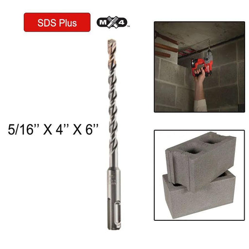 MILWAUKEEThe Milwaukee SDS-Plus 4-Cutter MX4 5/16 -inch X 4 -inch X 6 -inch Drill Bits feature solid carbide heads that deliver up to 5x longer life in conc...