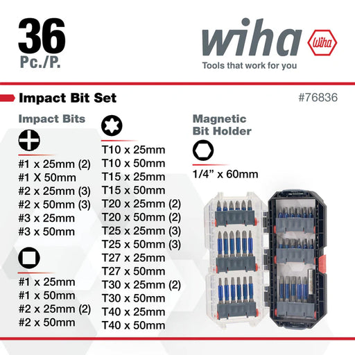 Wiha 76886 34 Piece MaxxTor Impact Bits Set with General Purpose Zipper Pouch