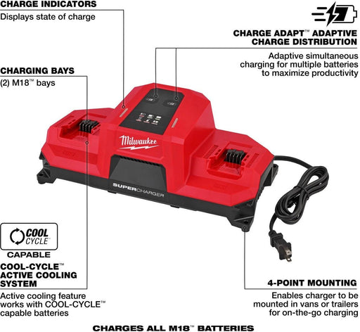 Original price $249.00 - Original price $249.00Original price$249.00$249.00 - $249.00Current price $249.00| /Milwaukee 48-59-1816 M18 Dual Bay Simultaneous Super Charger w/ 4 Point MountingMILWAUKEE ELECTRIC TOOL CORPThe MILWAUKEE M18 Dual Bay Simultaneous Super Charger with 4 Point Mounting delivers up to 6X faster charging to 80%, maximizing productivity by re... View full detailsOriginal price $249.00 - Original price $249.00Original price$249.00$249.00 - $249.00Current price $249.00| /