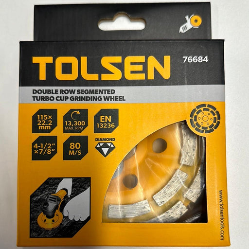 Original price $29.99Original price $29.99 - Original price $29.99Original price $29.99Current price $19.95$19.95 - $19.95Current price $19.95| /Tolsen 4-1/2″ Double Row Segmented Turbo Cup Grinding WheelTOLSENThe Tolsen Diamond Cup Wheel Double Row Blade is designed to the highest standards, using only quality diamonds. Double-row cup wheels are designed... View full detailsOriginal price $29.99Original price $29.99 - Original price $29.99Original price $29.99Current price $19.95$19.95 - $19.95Current price $19.95| /Save 33% Save %