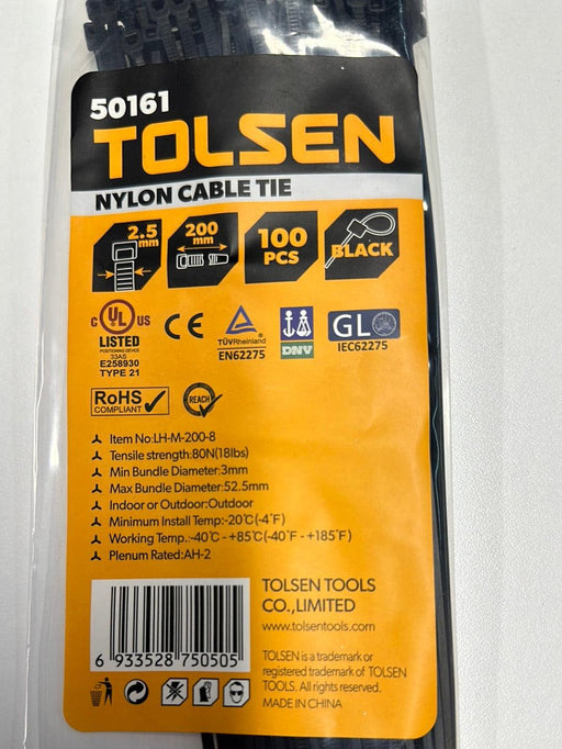 TOLSEN8"/200mm x 2.5mm " Zip Tie Tensile Strength: 80N(18lbs) Min Bundle Diameter: 3mm Max Bundle Diameter: 52.5mm Rated For Outdoor Use Minimum Install ...